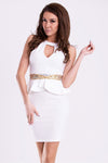 A simple sleeveless dress with an open back. At the waist a basque and decorative stones and sequins.