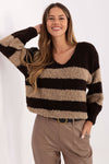 Stylish and comfortable women's sweater with a loose fit is the perfect choice for everyday wear. Made of a soft and pleasant to the touch blend of acrylic, polyester, wool, viscose, and alpaca, it provides warmth and comfort throughout the day. The model has a standard length, long sleeves, and a V-neckline that subtly accentuates the neck and adds a feminine touch. The striped pattern gives it a fashionable, casual style that fits perfectly into everyday outfits. This sweater is an ideal option for casual, everyday occasions, combining a trendy look with comfort and timeless charm.