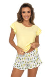 Bathed in sunny joy, ANANAS two-piece pajamas. The shirt has a loose cut with a gently rounded neckline. Attention is drawn to the sleeves finished with impressive ruffles. Short shorts closed at the bottom with a pleated pleat, decorated with a motif of multicolored pineapples. Pajamas available in two color variants - yellow and purple shirt with patterned shorts. Made in Poland.