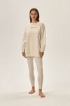 The Fune set is a two-piece ensemble made of pleasant to the touch fabric. It consists of a loose top with a print and long sleeves, as well as ankle-length leggings. The leggings have a wide elastic waistband. This beige women's loungewear will appeal to you if you are a fan of comfortable clothing in light, neutral colors.