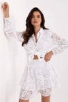 Elegant and feminine women's set in boho style, perfect for everyday wear, work, and formal occasions. It consists of an airy shirt with long sleeves, a classic collar, and button fastening, made of breathable cotton and nylon blend. Delicate lace finishes add a romantic character to the whole. The set is complemented by short skirt shorts with a frill, wide legs, and a comfortable elastic waistband. The skirt shorts also have a lining, which ensures comfort and freedom of movement while maintaining a subtle, feminine look. The high waist beautifully accentuates the waist, and the whole creates a coherent and eye-catching styling. This is an excellent proposition for women who appreciate boho style, comfort, and unique details in both everyday and more elegant outfits.