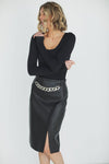 >Skirt made of high-quality eco leather finished with soft fleece underneath. In fact, it is deceptively similar to natural leather. The fabric is stretchable. Classic cut for a stylish woman. Metal trims in the form of a chain (detachable) add spice. Length past the knee.