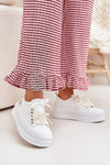 Women's sneakers made of eco leather, set on a massive platform, are a combination of comfort and style. The model stands out with decorative lacing with pearls, which add a stylish accent to them. The soft insole provides comfort throughout the day. Perfect for casual stylizations, these sneakers combine a trendy look with functionality.